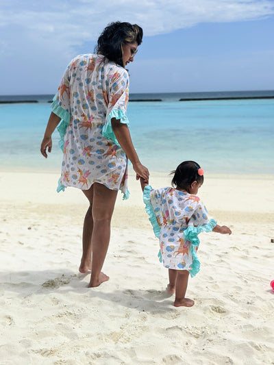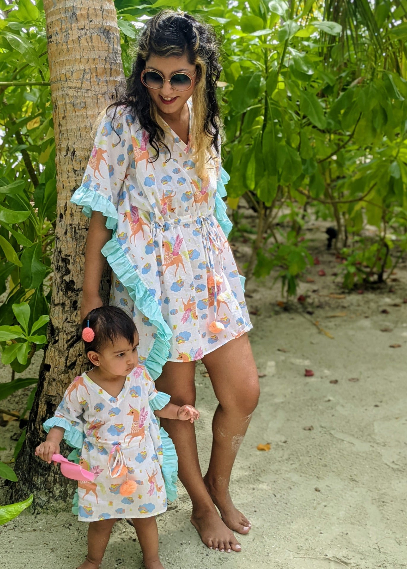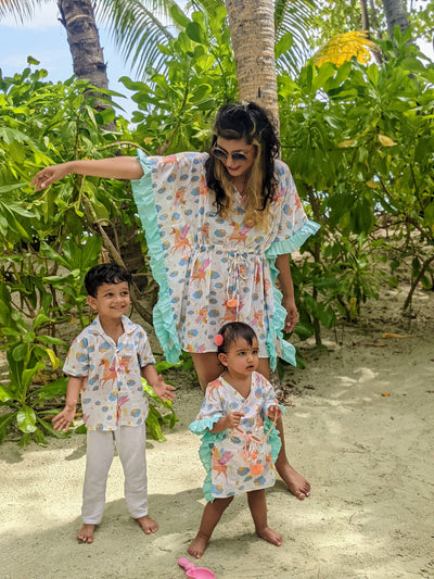 Soft as a cloud, our breezy malmal kaftans are the perfect beachwear, lounge-wear, vacation-wear, chill-at-home-and-do-nothing-wear. What's more, we have these in sizes for newborns all the way to adults, so you can twin with your babies, besties, sisters, everyone!