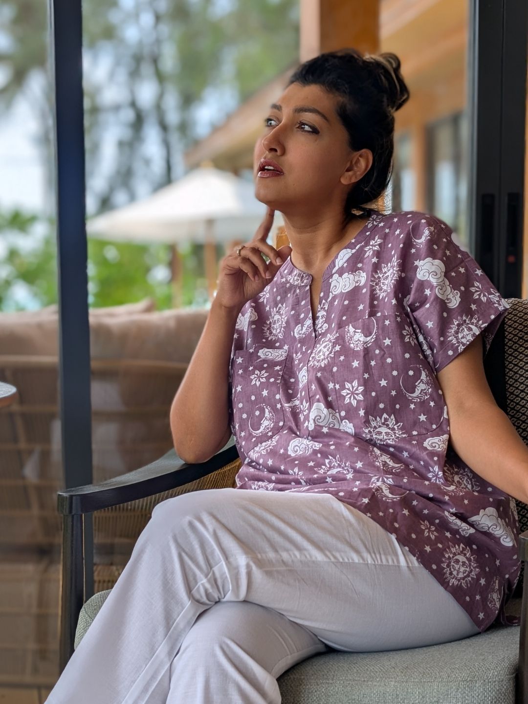 Made from pure cotton malmal , this soft and breathable nightwear set is perfect for lounging, sleeping, or working from home. Designed with Indian summers in mind, the lightweight fabric keeps you cool while the relaxed fit pajama set ensures maximum comfort. Also ladies - this pajama comes with pockets!