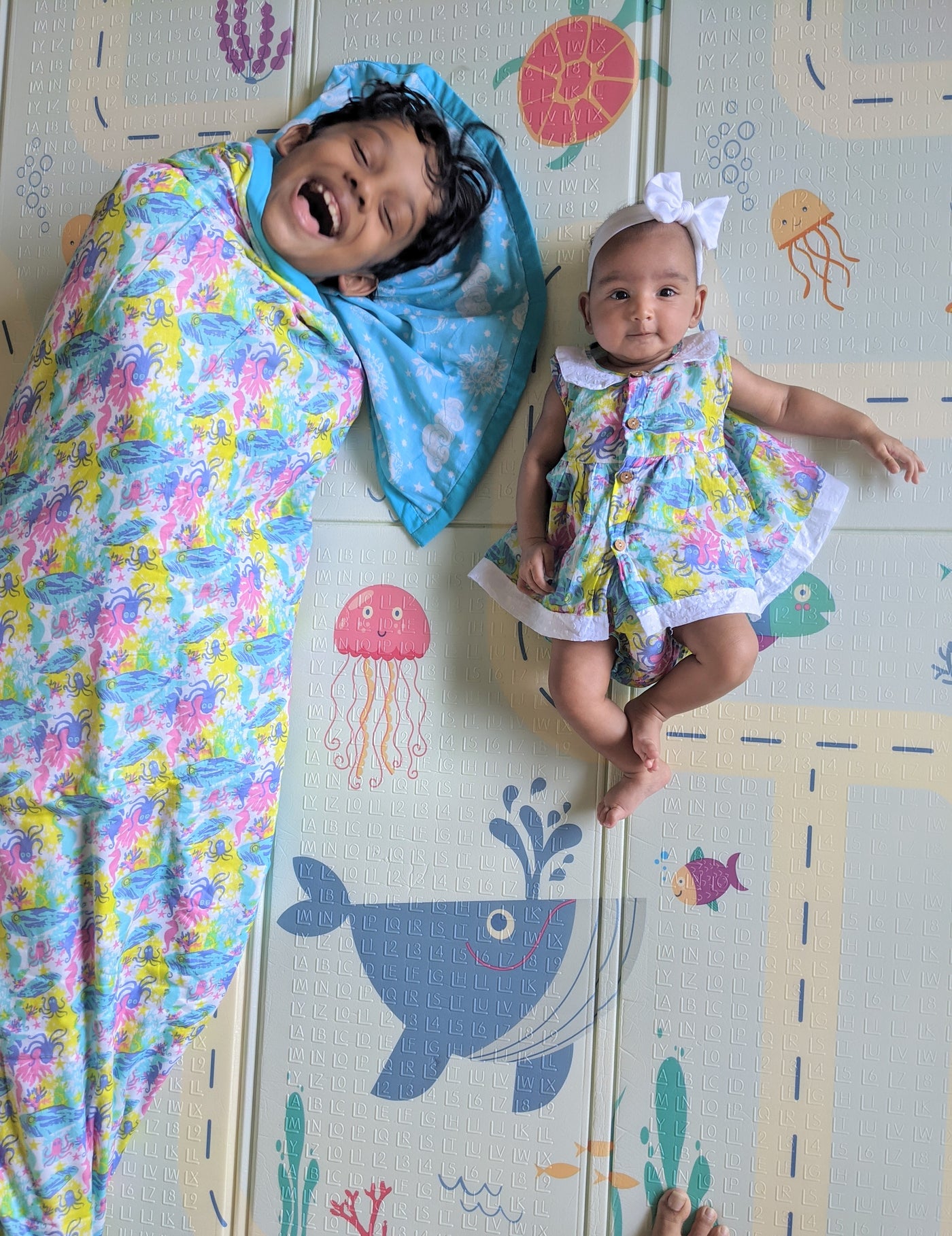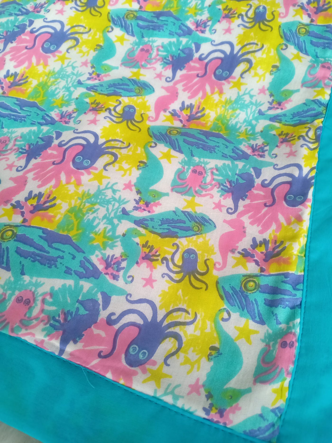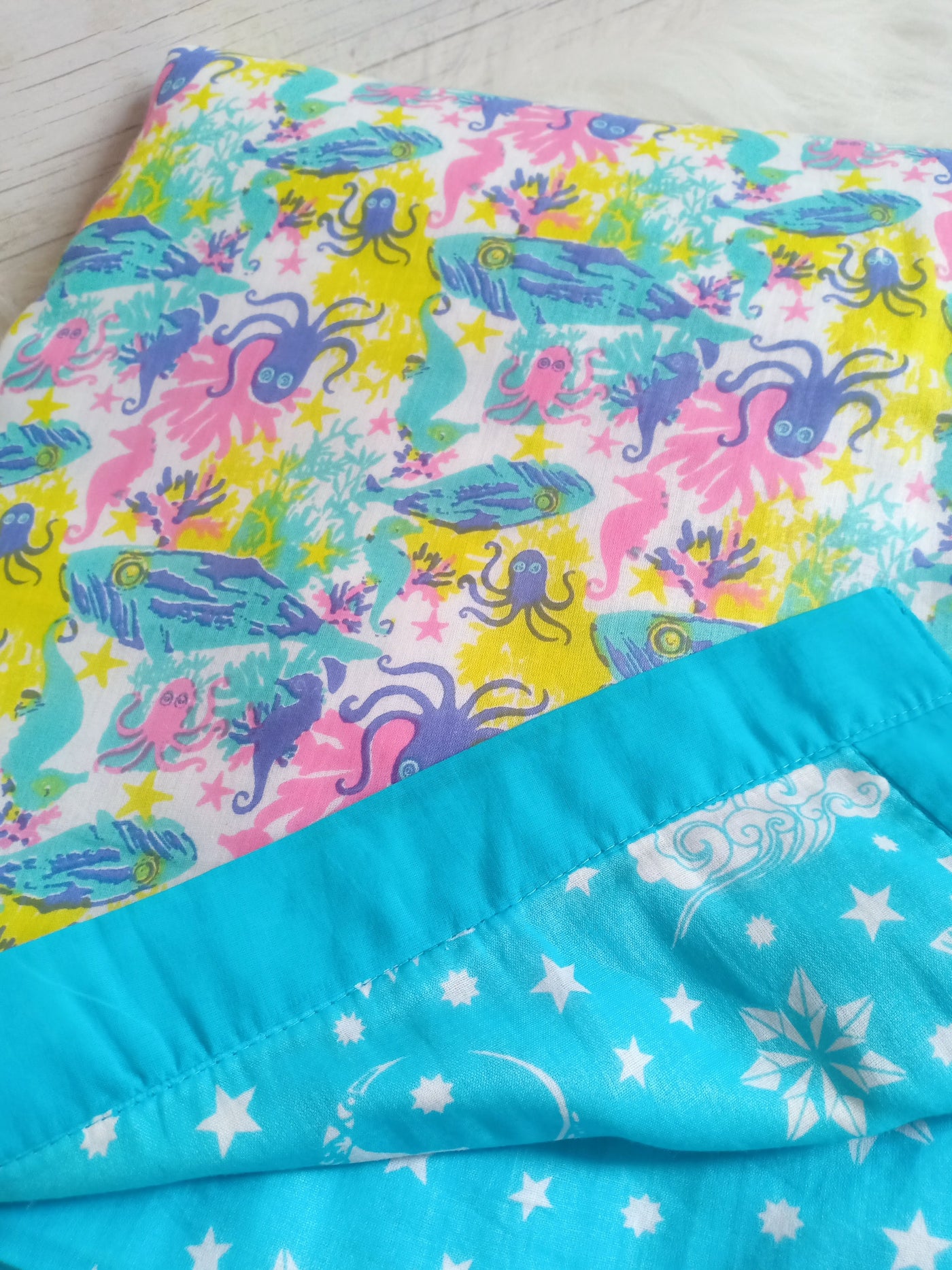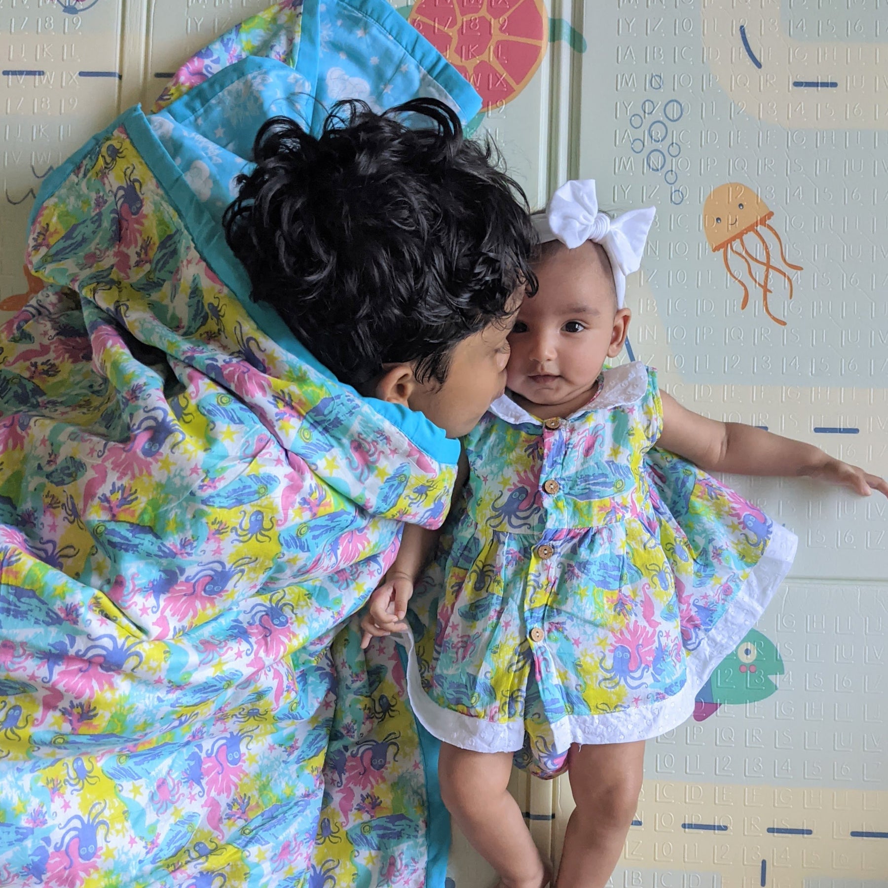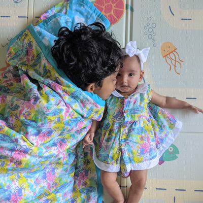Have you ever seen a sea horse play hide and seek with an octopus? Or a newborn whale calf being fussed upon by its protective mother? Both of us at Team Tura Turi simply adore the ocean, and one of us is a certified diver. This blanket has been inspired by her dives in seas across the world ... from the stunning, vibrant corals in the Andaman Sea to the playful fish in the Sea of Koro near Fiji. Nothing can really replicate the enchanted beauty of the ocean, but with this muslin blanket painted in soft pastel watercolour tones, we hope to bring alive some of that magic in your toddler's life.