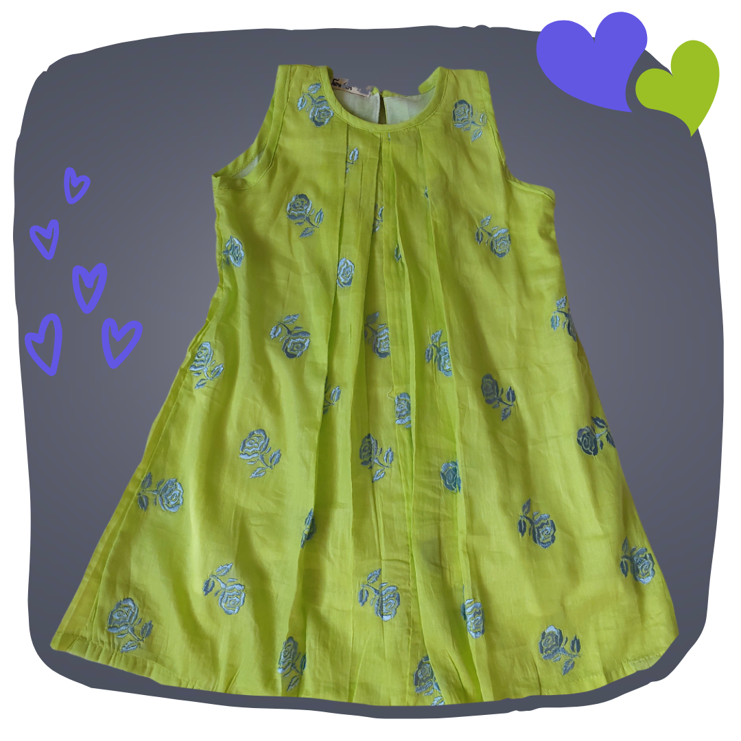 A summery lime green dress with elegant powder blue roses embroidered all over. Simple yet so dressy.