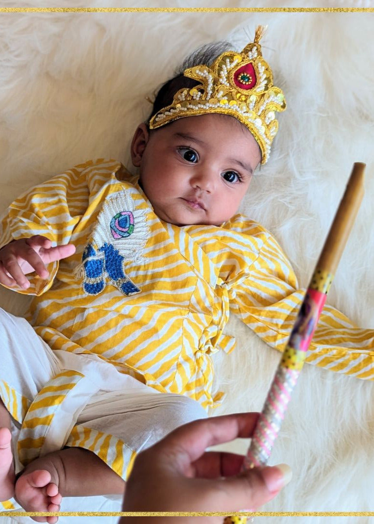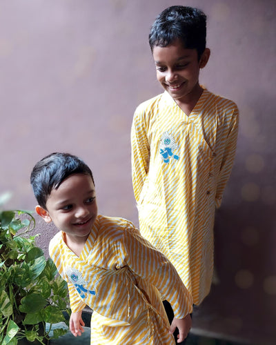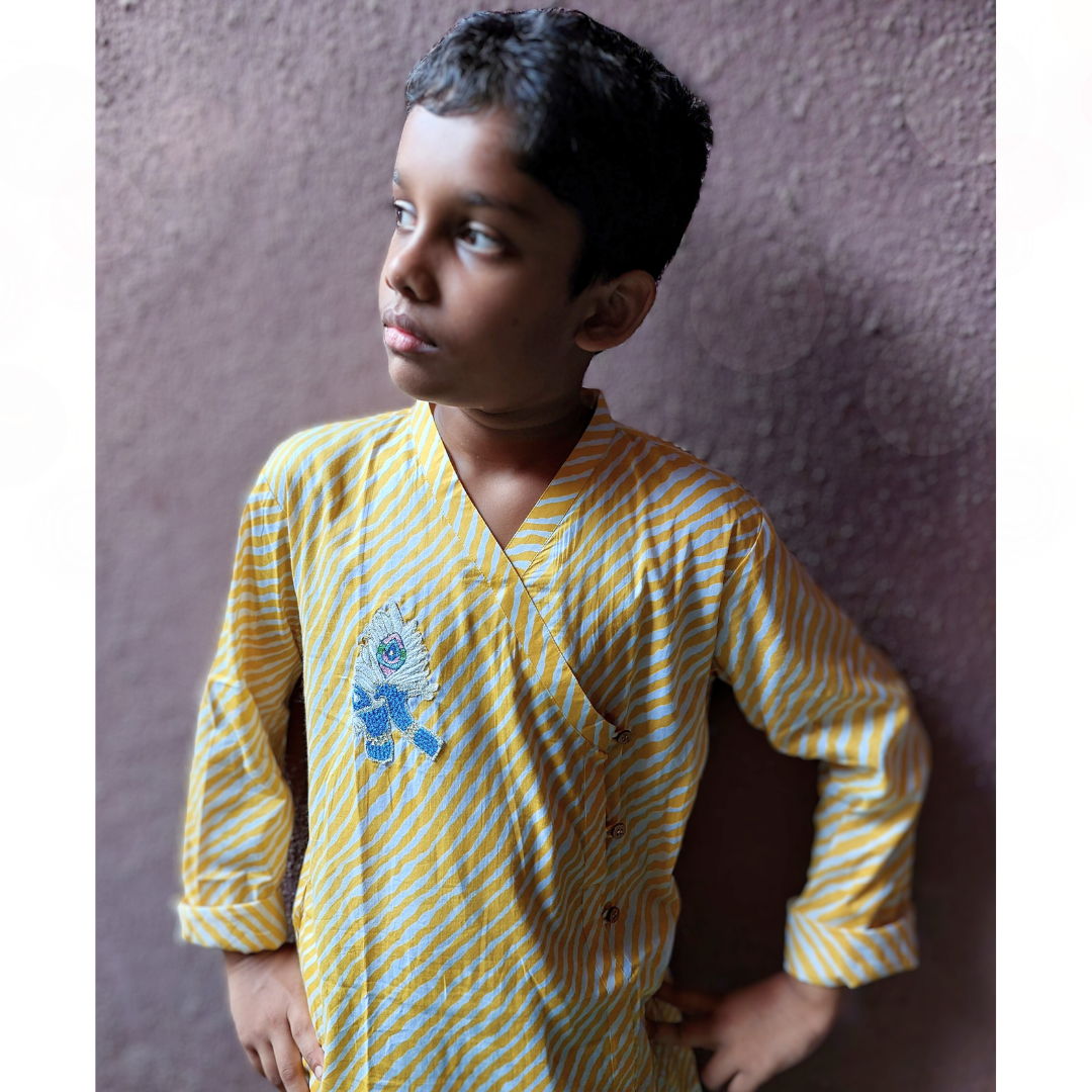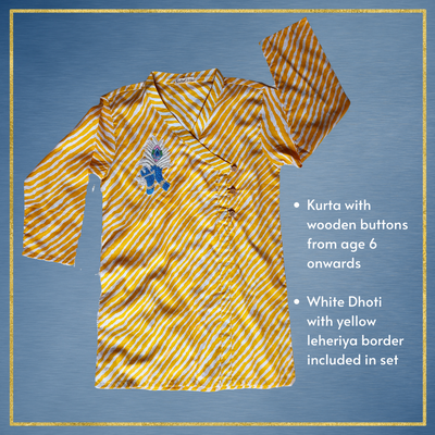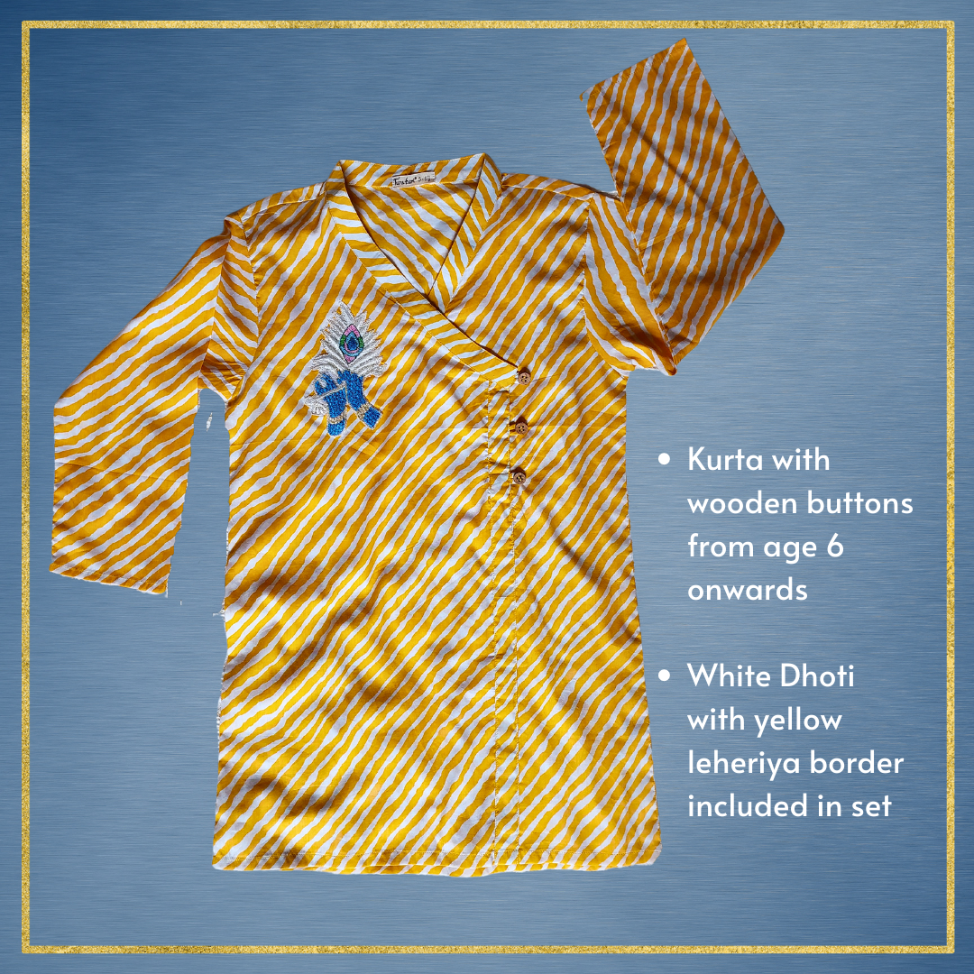 Simple yet so dressy. An elegant embroidered Krishna motif on a classic yellow and white leheriya kurta. A soft ensemble outfit that feels festive at the first touch.