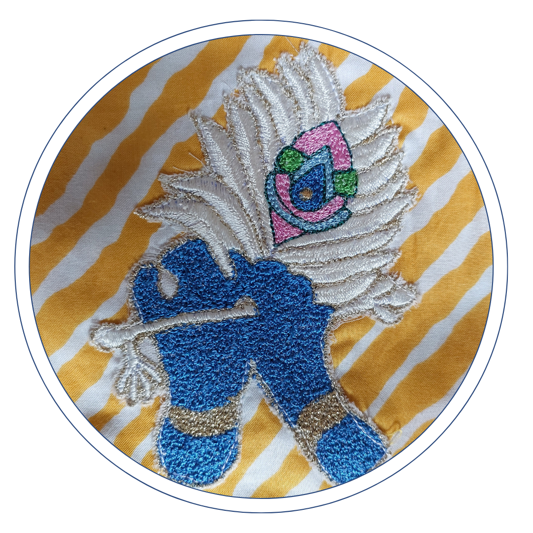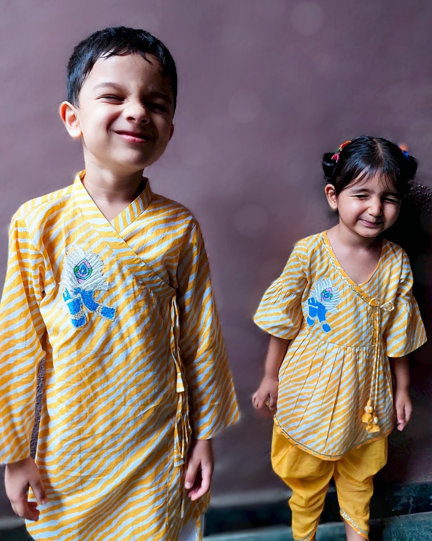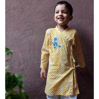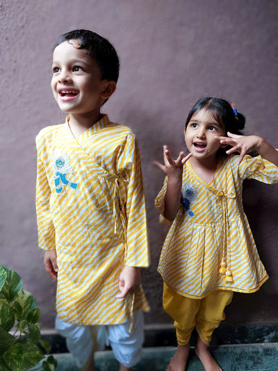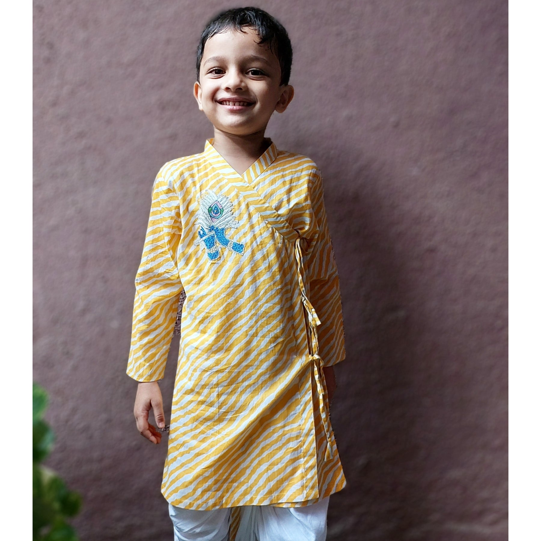 Simple yet so dressy. An elegant embroidered Krishna motif on a classic yellow and white leheriya kurta. A soft ensemble outfit that feels festive at the first touch.