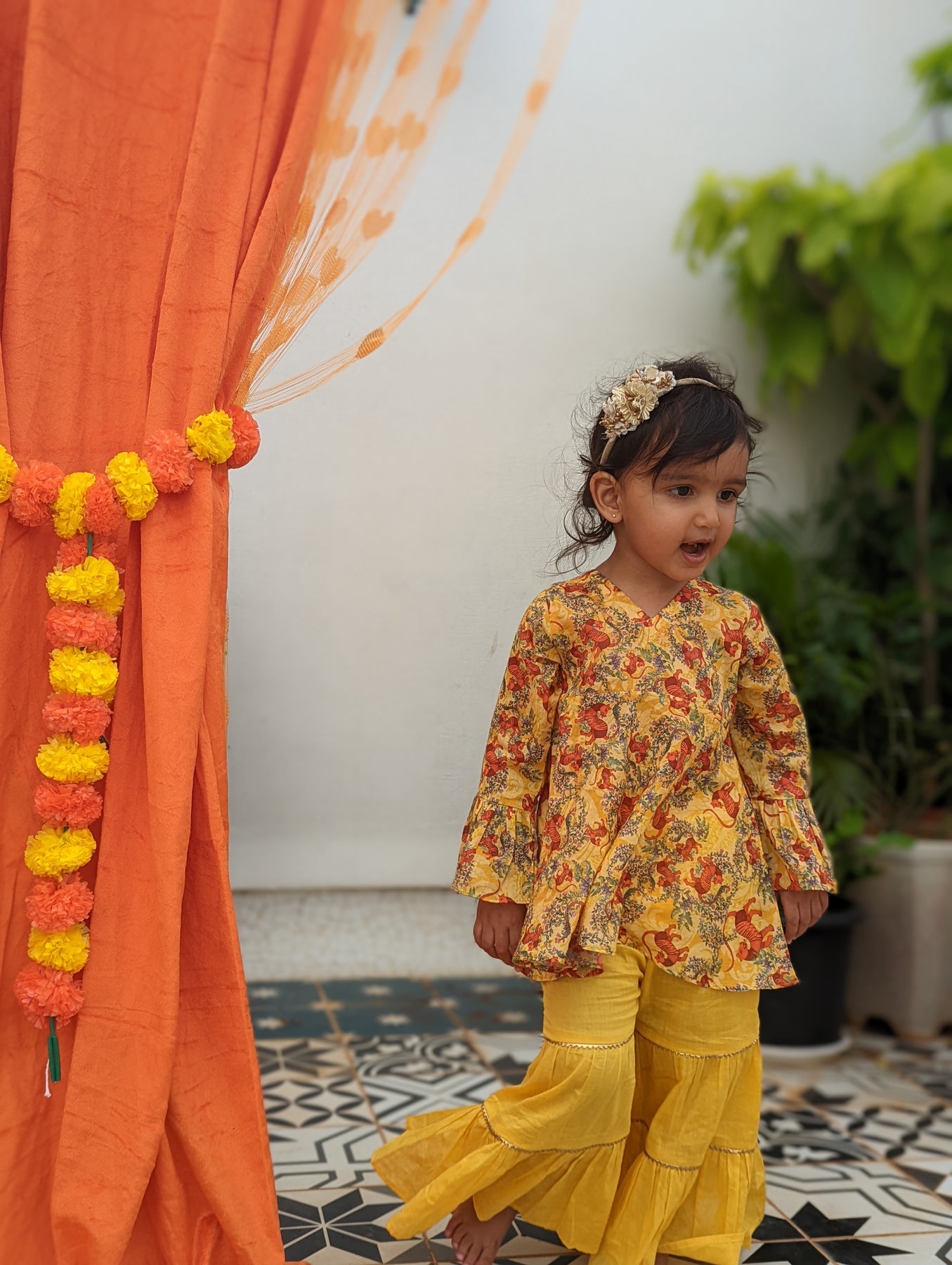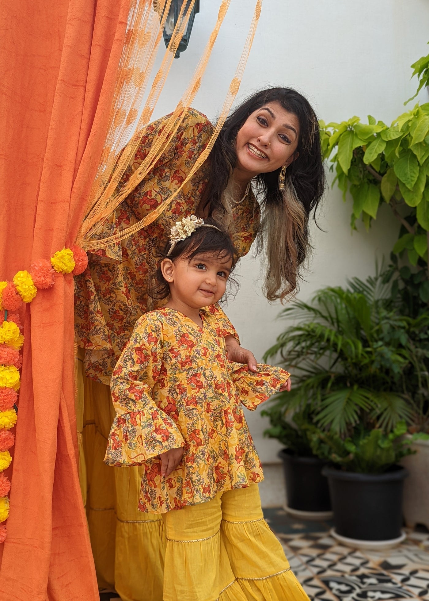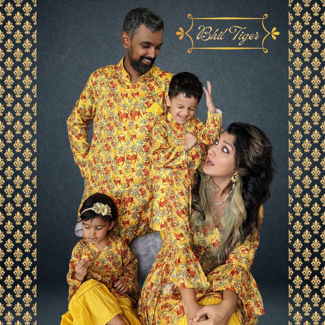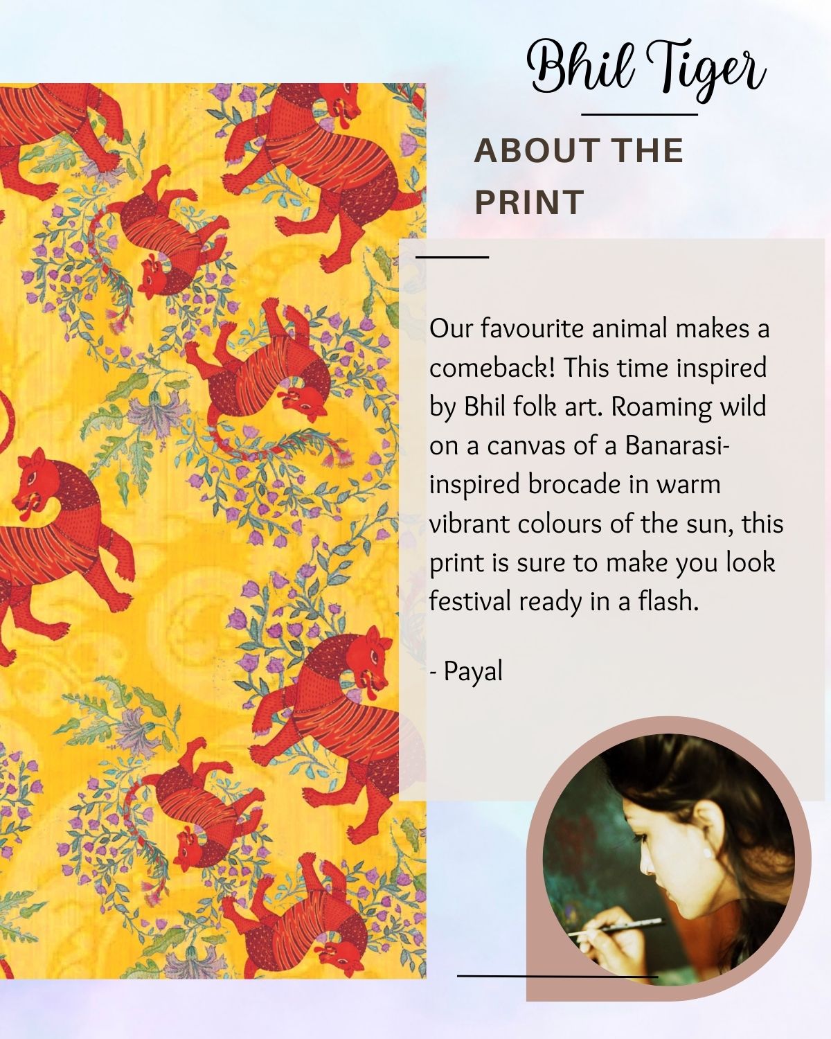 About the printOur favourite animal makes a comeback! This time inspired by Bhil folk art. Roaming wild on a canvas of a Banarasi-inspired brocade in warm vibrant colours of the sun, this print is sure to make you look festival ready in a flash.