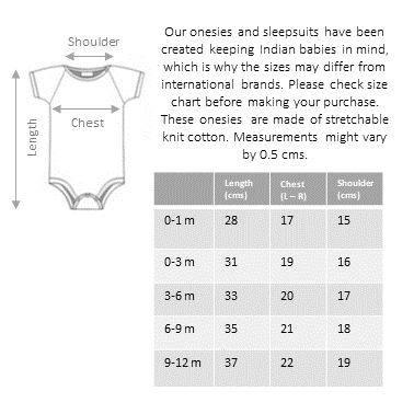 Our onesies and sleepsuits have been created keeping Indian babies in mind, which means sizes may differ from international brands. Please check our size chart before making your purchase. For reasons of hygiene, we do not offer Returns and Exchanges on Onesies and Sleepsuits.