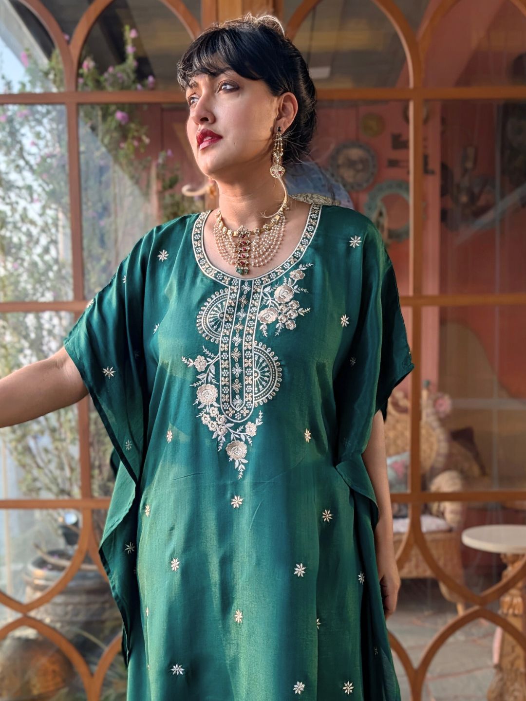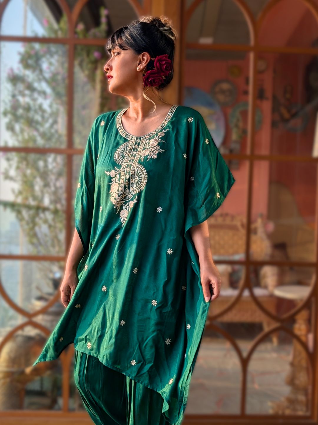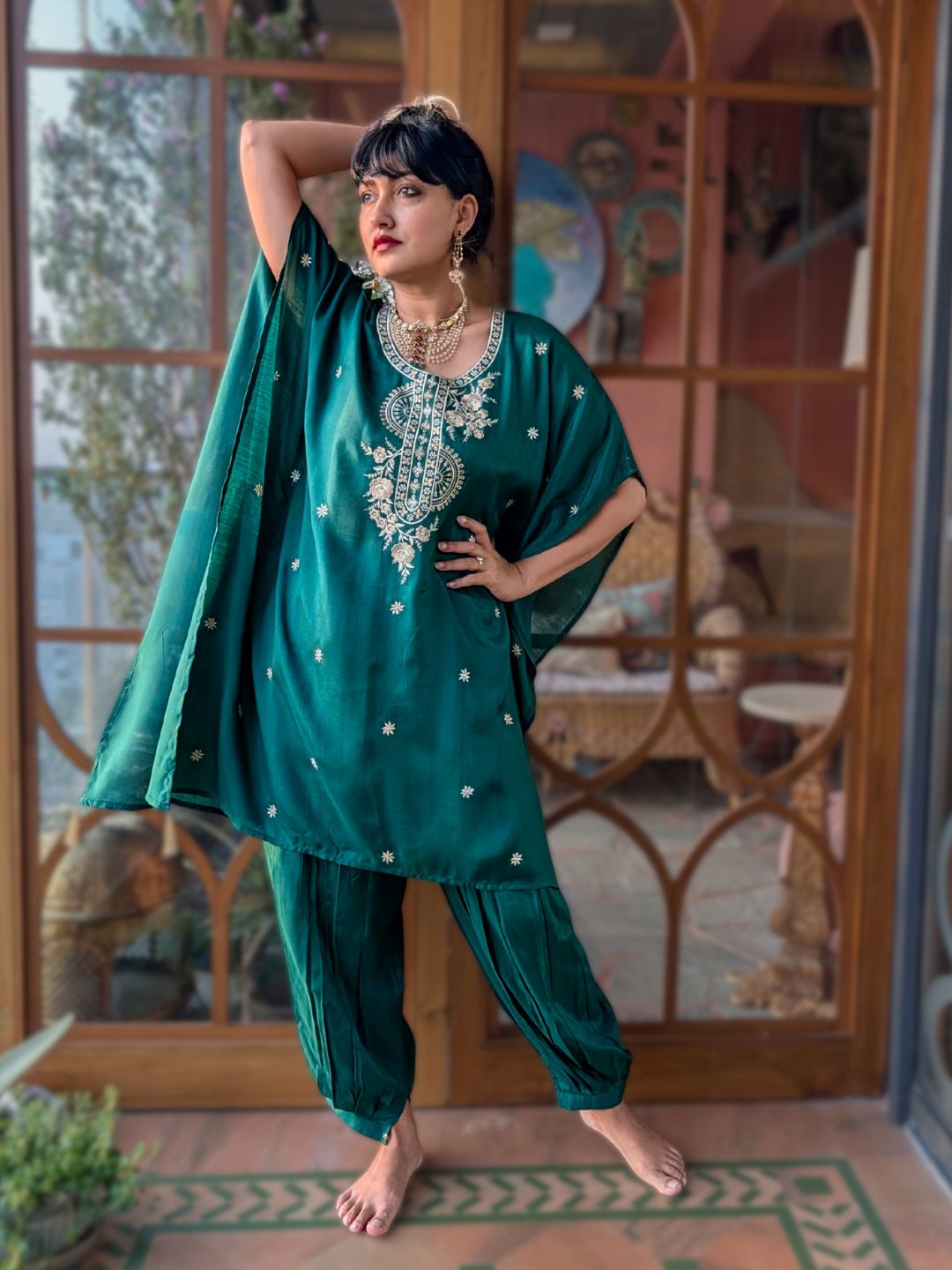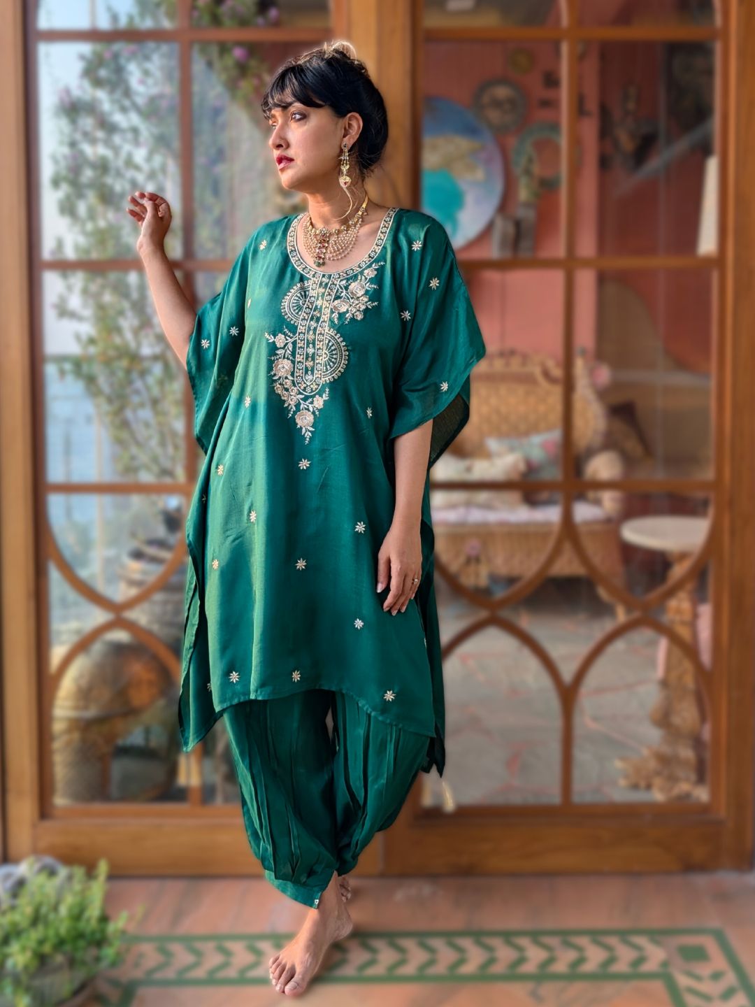 Embroidered Silk Kaftan with Afghan Pants | Emerald Green